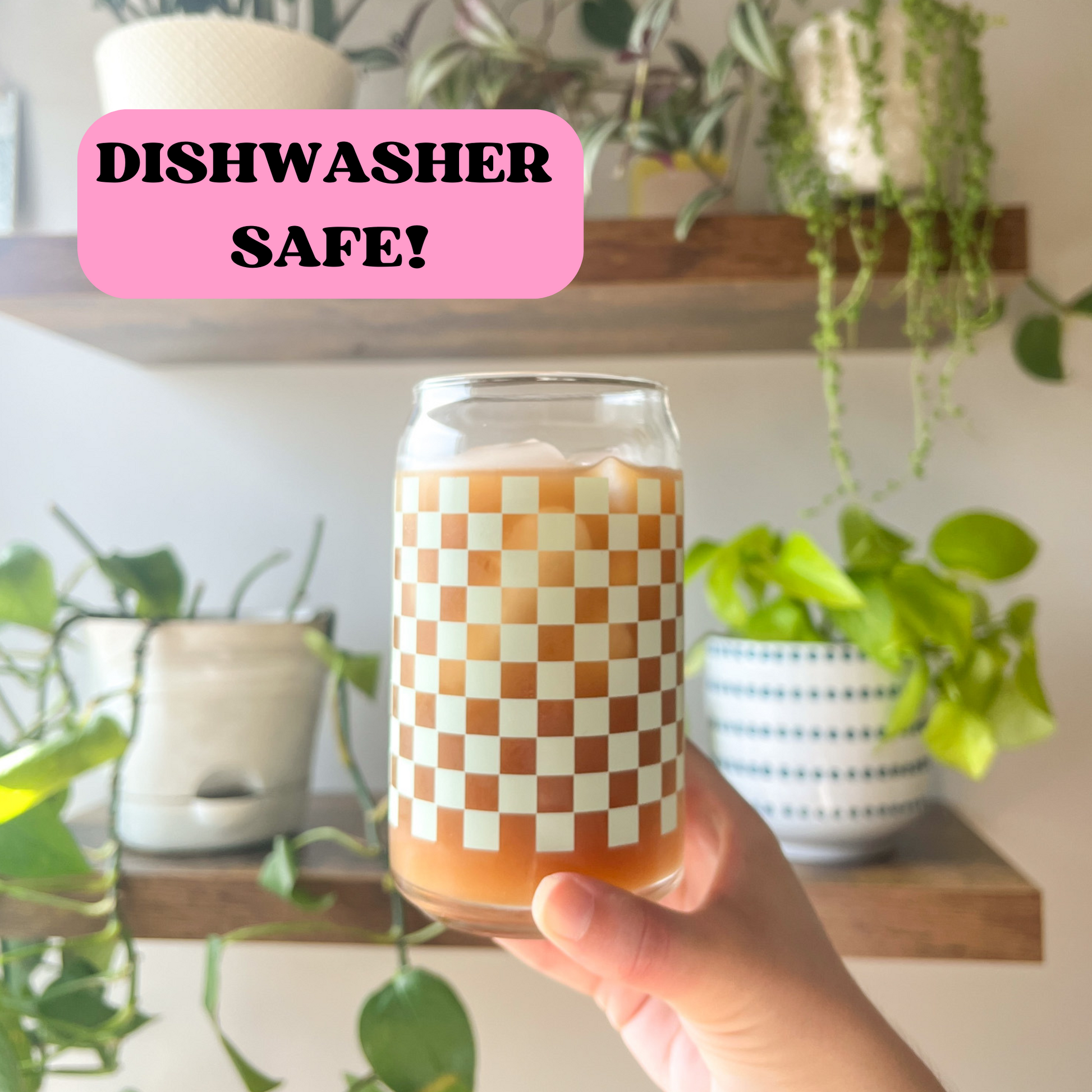 16 oz can glass cup is perfect for your favorite hot and cold beverages. Sage green checker print design is printed all around the glass making it a seamless wrap.