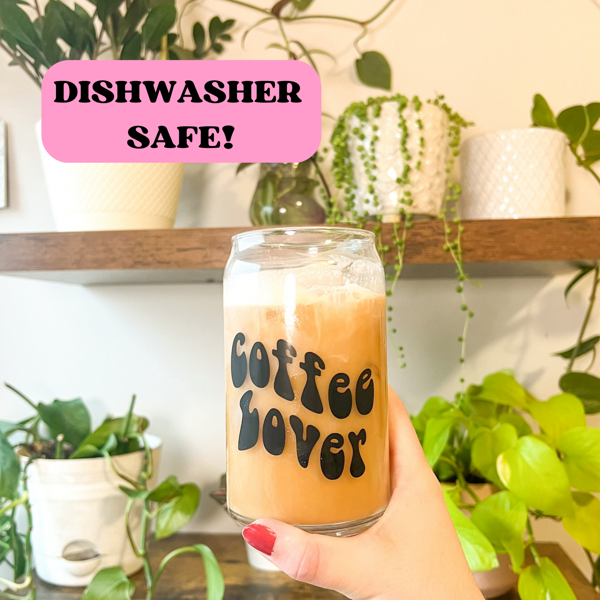 16 oz can glass cup is perfect for your favorite hot and cold beverages. Coffee lover design is printed onto the front of the glass.
