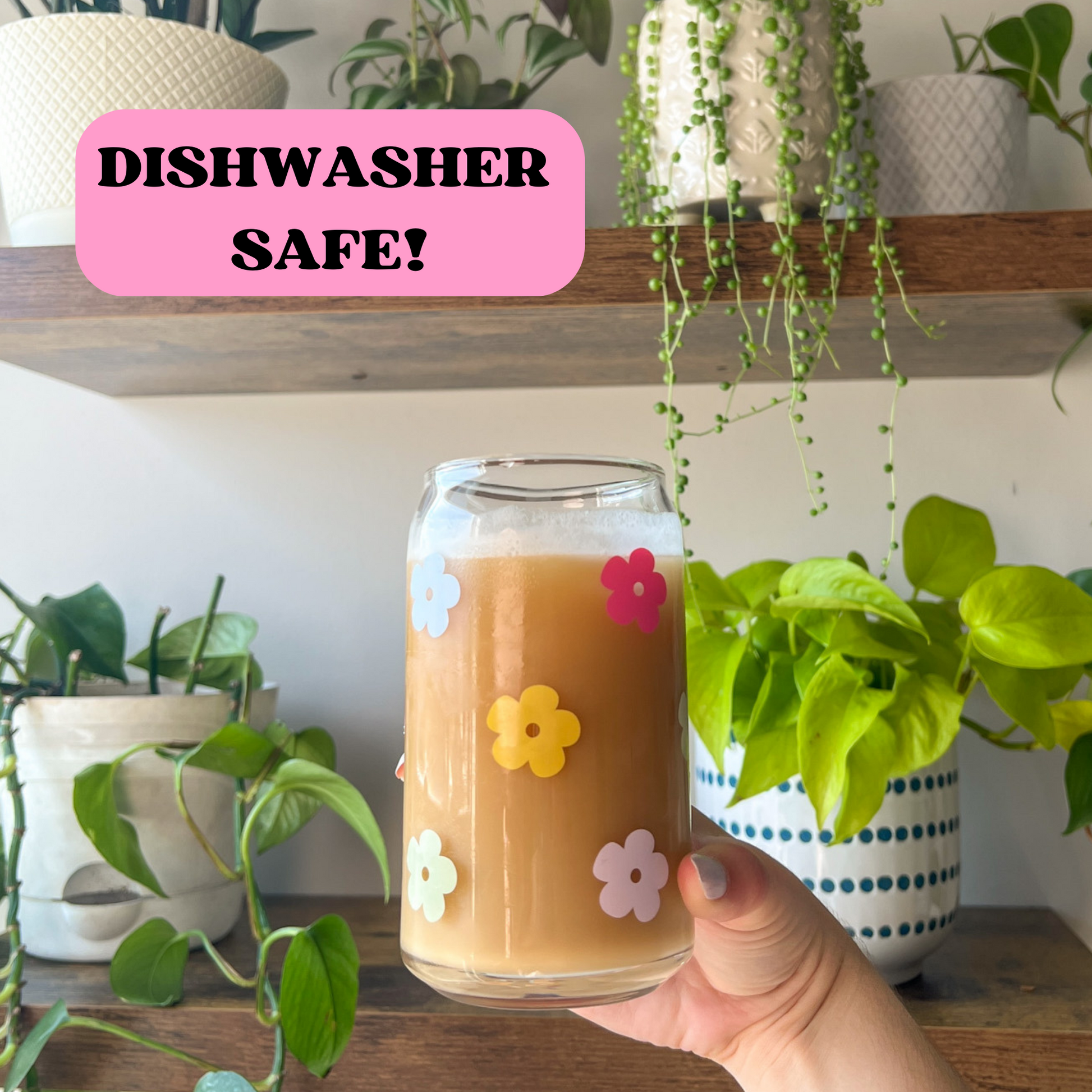 16 oz can glass cup is perfect for your favorite hot and cold beverages. Multi colored retro flower design is printed all around the glass making it a seamless wrap.