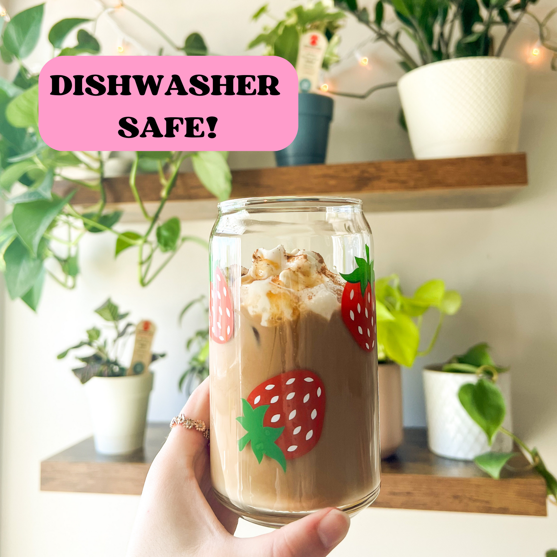 16 oz can glass cup is perfect for your favorite hot and cold beverages. Strawberry design is printed all around the glass making it a seamless wrap.
