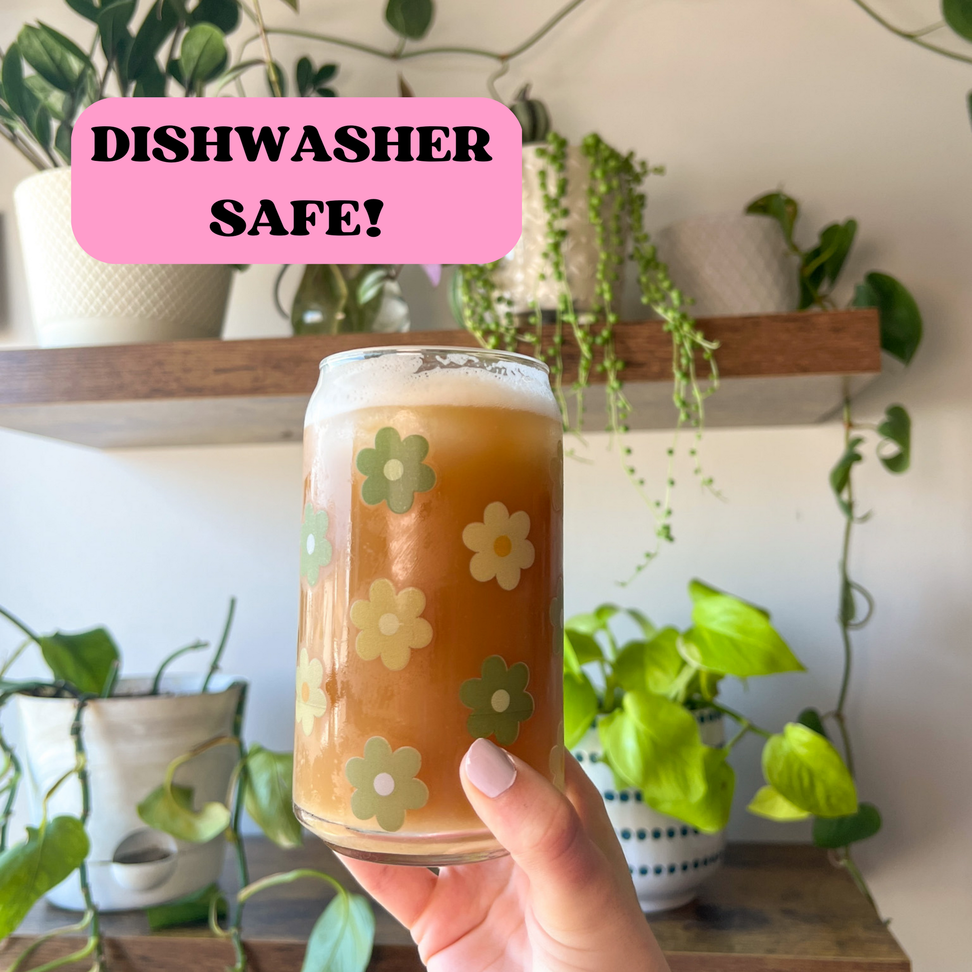 16 oz can glass cup is perfect for your favorite hot and cold beverages. Daisy design is printed all around the glass making it a seamless wrap.