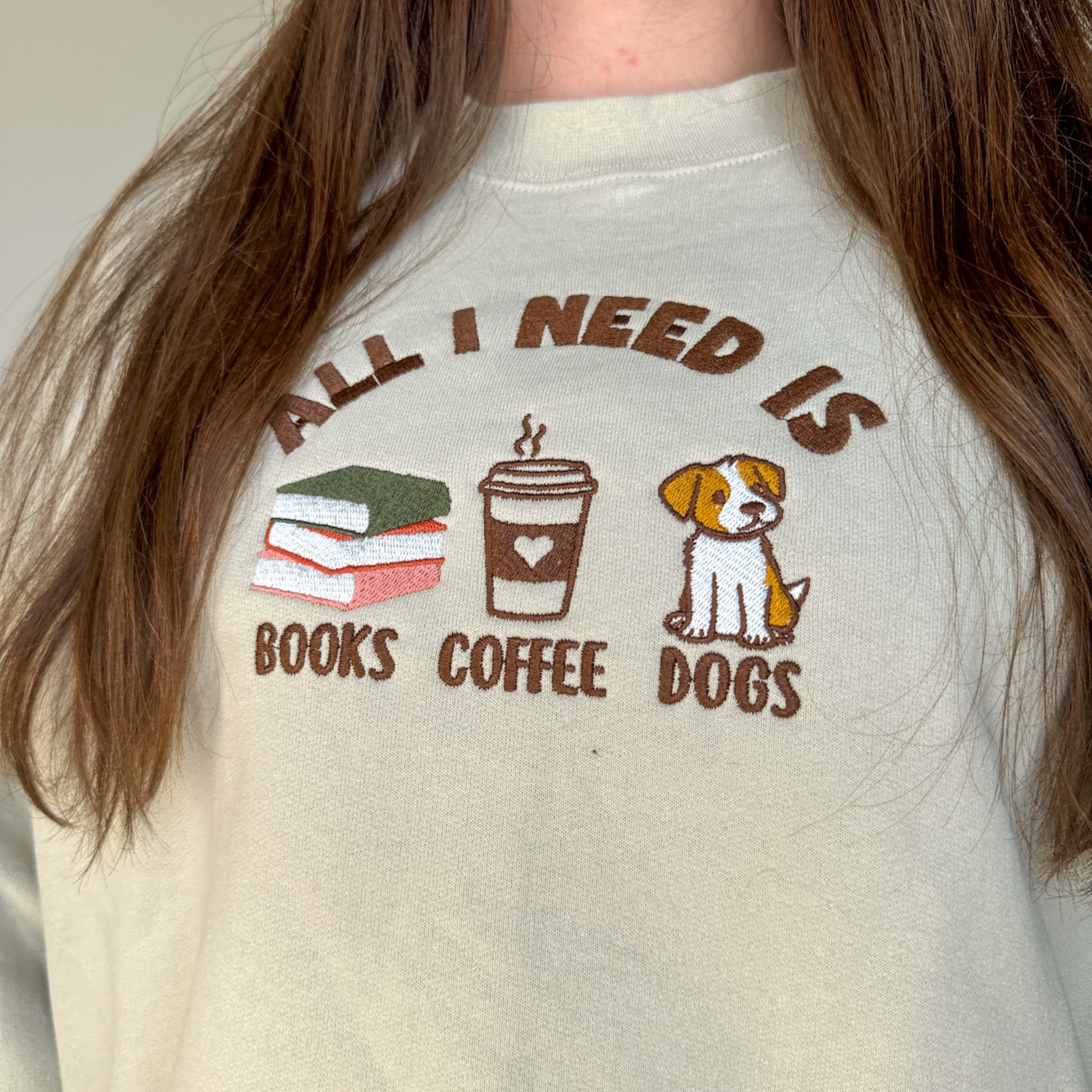 All I Need Is Books, Coffee, Dogs Embroidered Crewneck